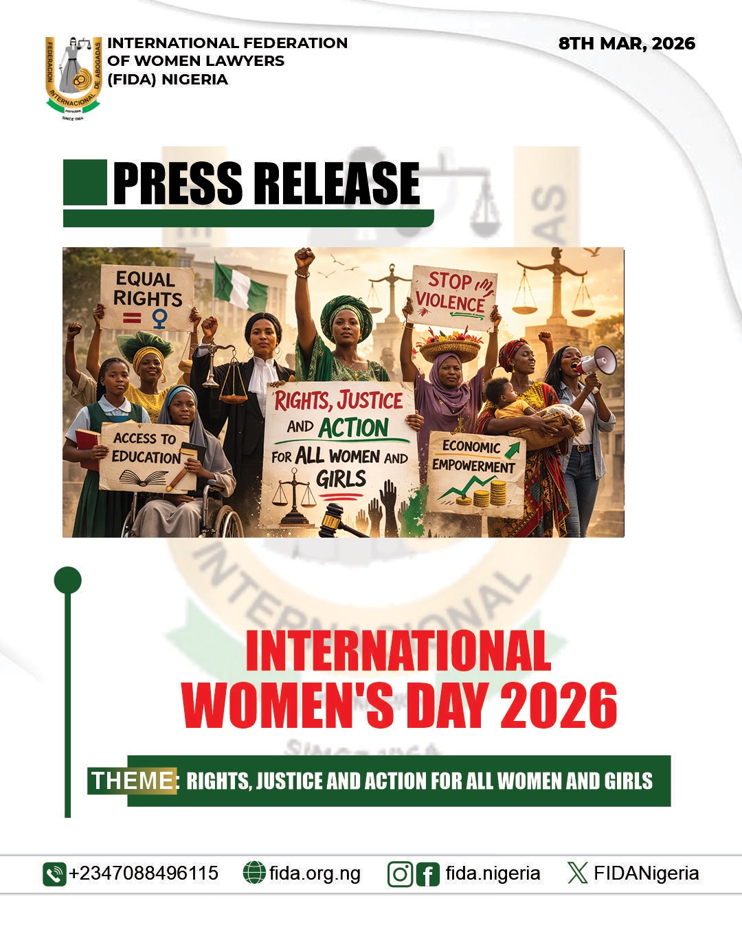 On International Women’s Day 2026, the International Federation of Women Lawyers (FIDA) Nigeria celebrates the resilience, strength, and courage of women and girls across the nation. At the same time, we renew our call for a justice system and a society that do not ask women to endure in silence while institutions move at the pace of bureaucracy.