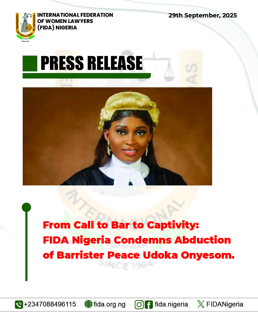 The International Federation of Women Lawyers (FIDA) Nigeria condemns the abduction of Barrister Peace Udoka Onyesom and her sister on September 27, 2025,...